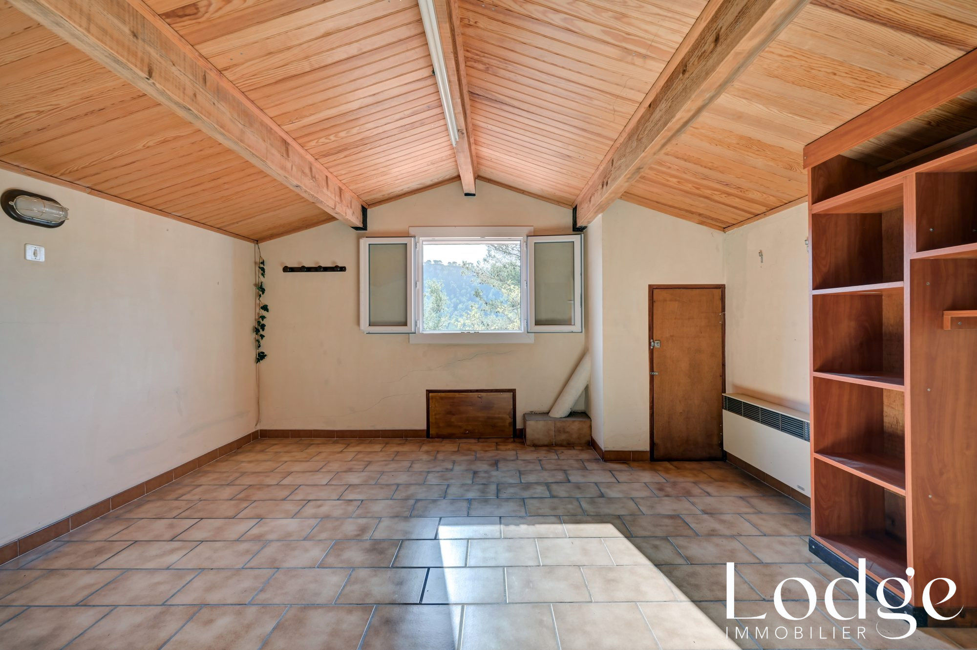Le deuxième niveau offre une chambre mansardée d'environ 15 mètres carrés avec rangements.
