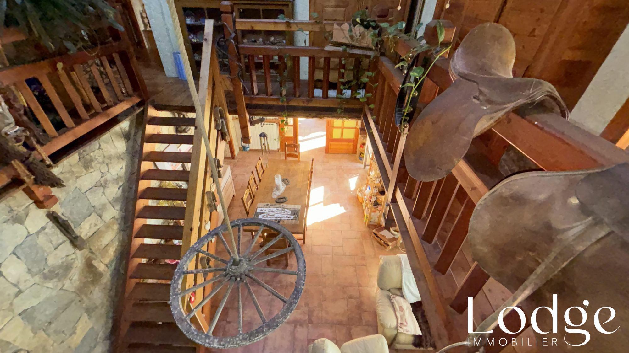 Hall d'entrée, superbe séjour cathédrale avec imposante cheminée, accès terrasse et jardin, spacieuse et lumineuse cuisine avec terrasse, bureau, chambre, salle de bains, wc.